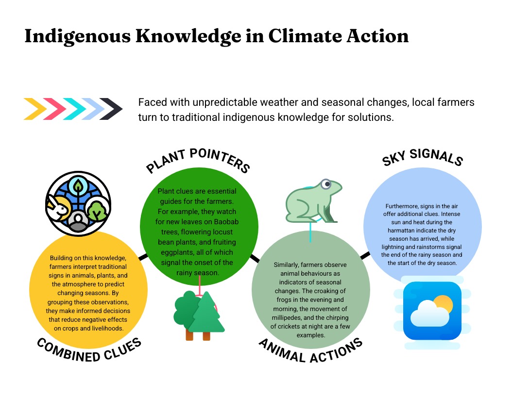 “We rely on indigenous adaptation strategies that use natural indicators to forecast weather patterns, an approach that enables us to adjust planting schedules and mitigate crop failure, “says an old farmer, Baba Bola