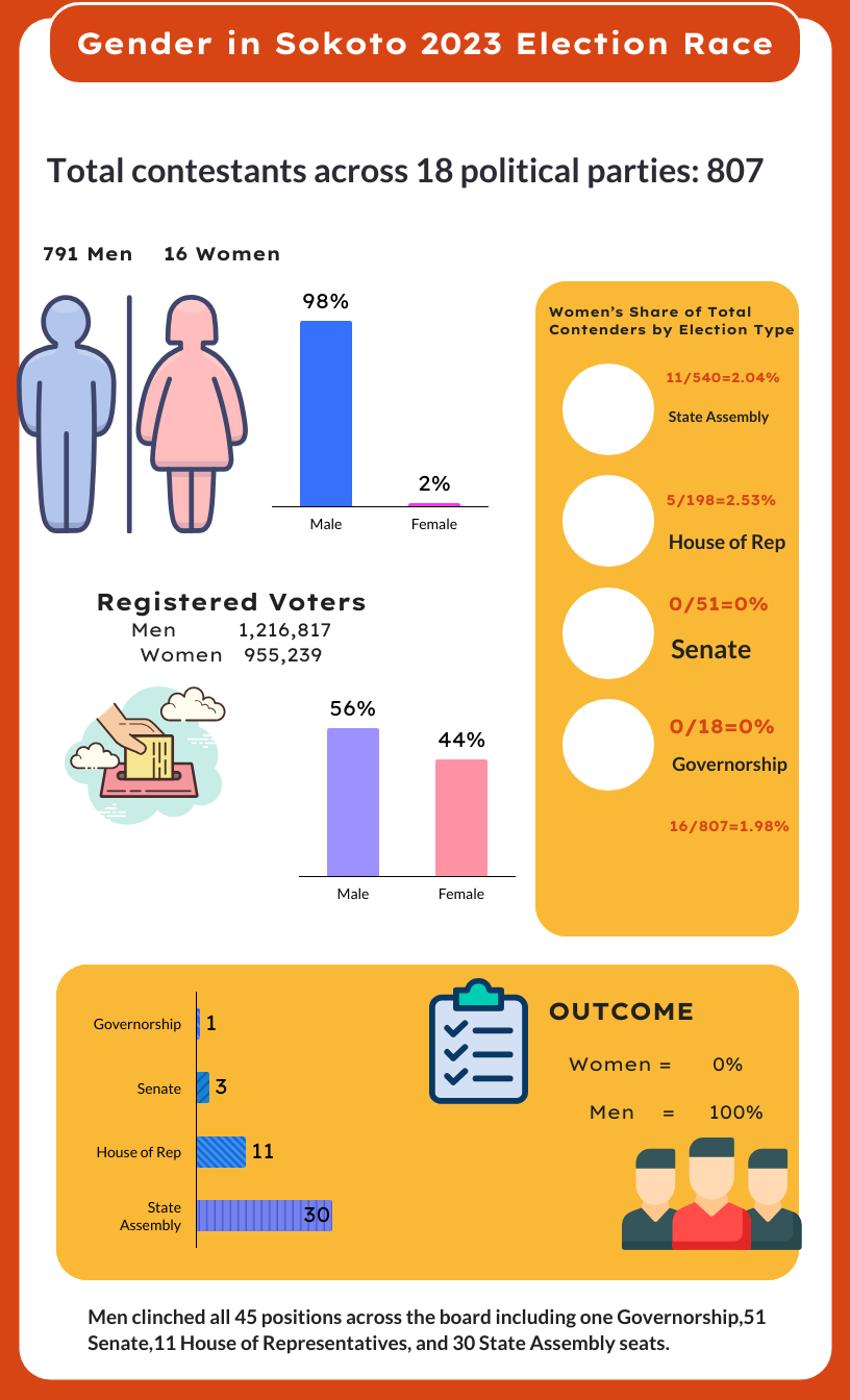 Out of 45 candidates vying for elective positions in Sokoto State in 2023, only about 2% were women, and not a single one emerged victorious.