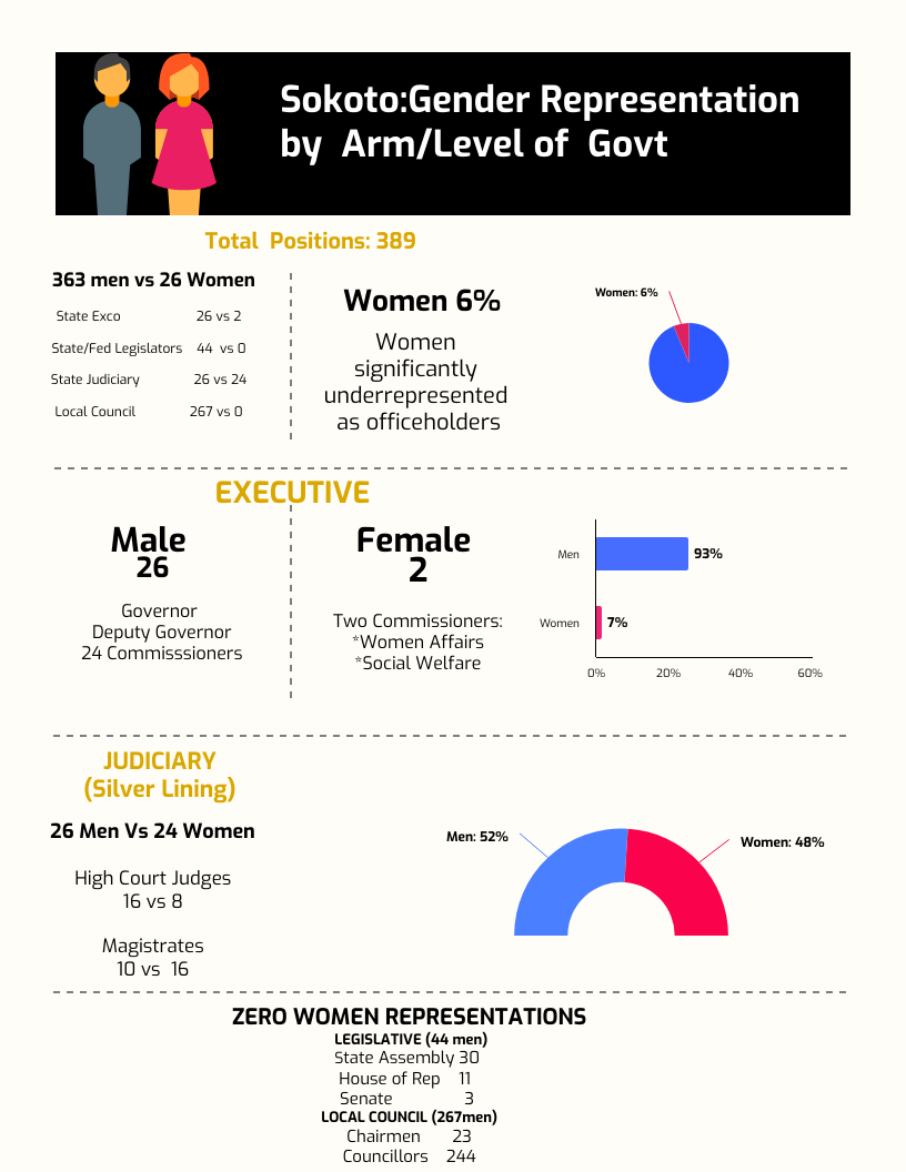 There are currently no women among the 30 Sokoto State House of Assembly members or the 267 local government positions, including the 23 LG Chairs and 244 councillors.