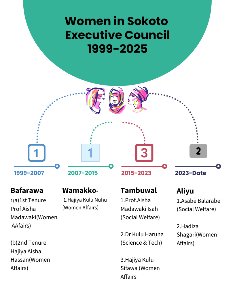 Since 1999, there has been one woman commissioner under each of the Bafarawa (1999-2007) and the Wamakko (2007-2015) administrations, increasing to three under Tambuwal (2015-2023).